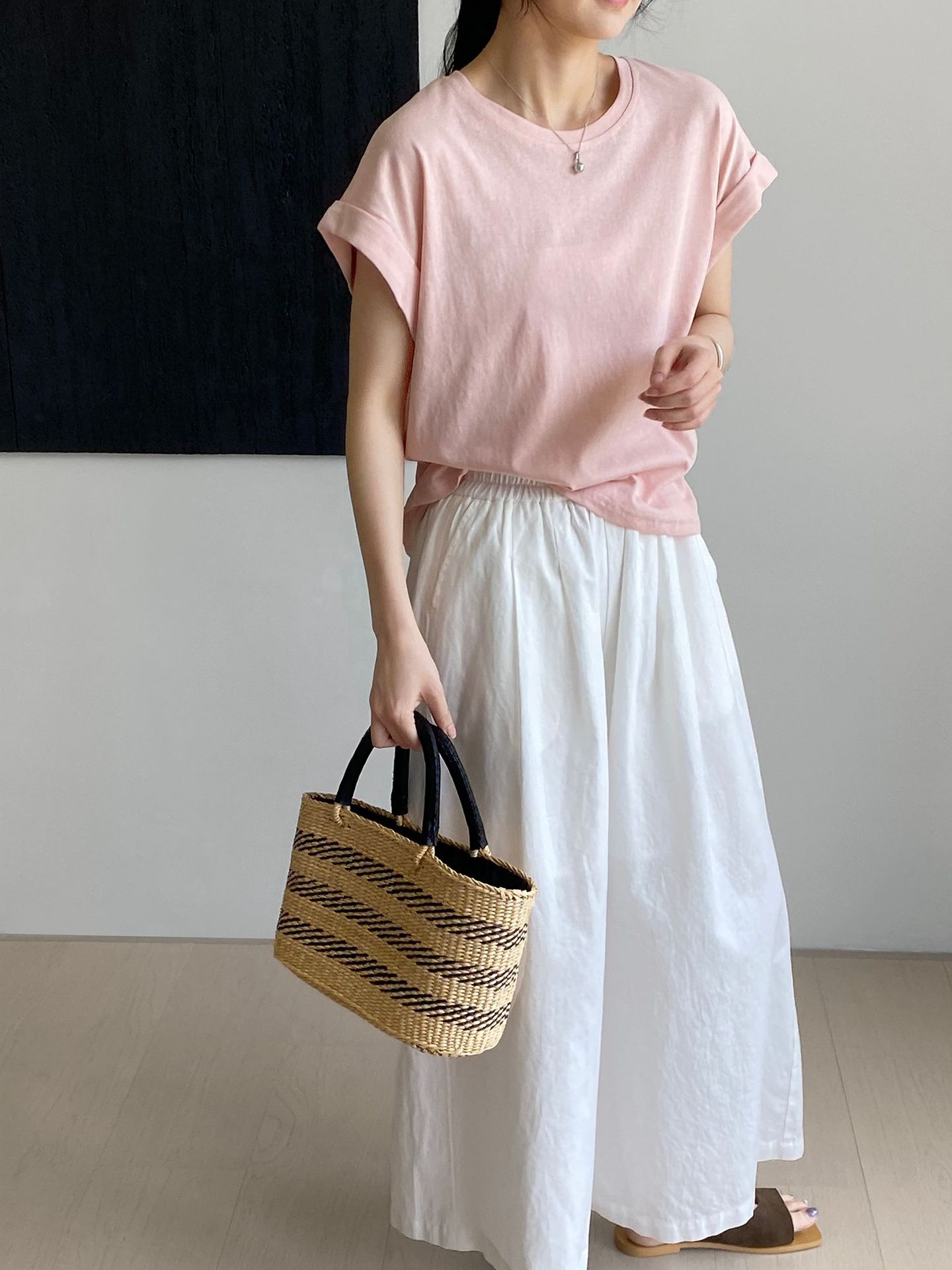 ロールアップした袖口がこなれた雰囲気を演出し、カジュアルな中にも洗練された印象を与える
