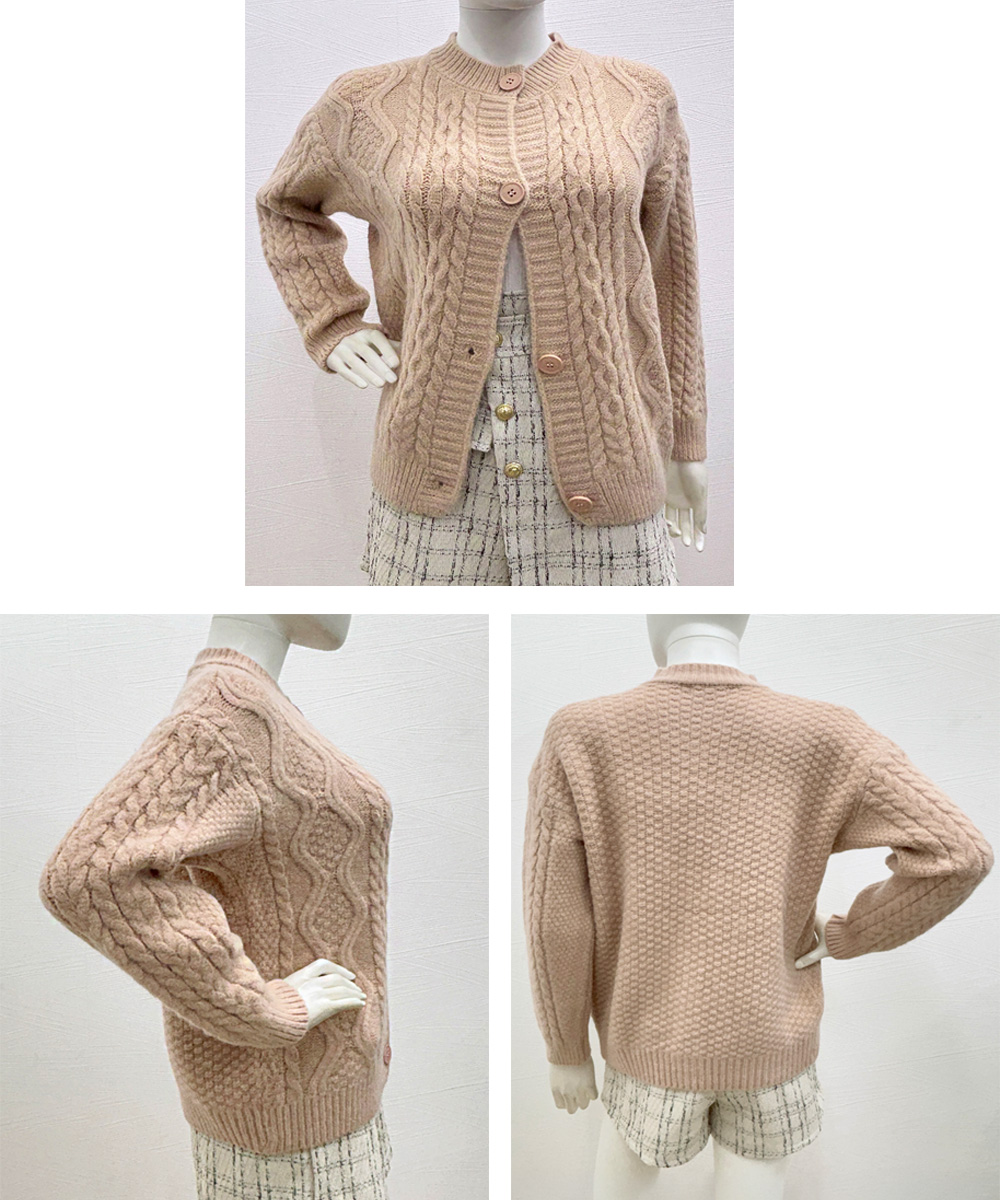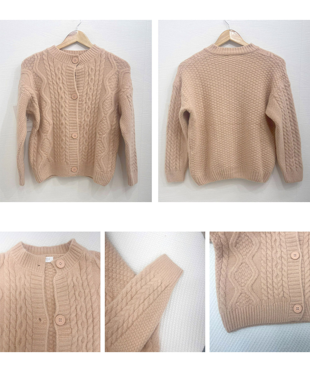 丁寧に編まれたケーブル模様が全体に施されており、上品で温かみのある印象を演出