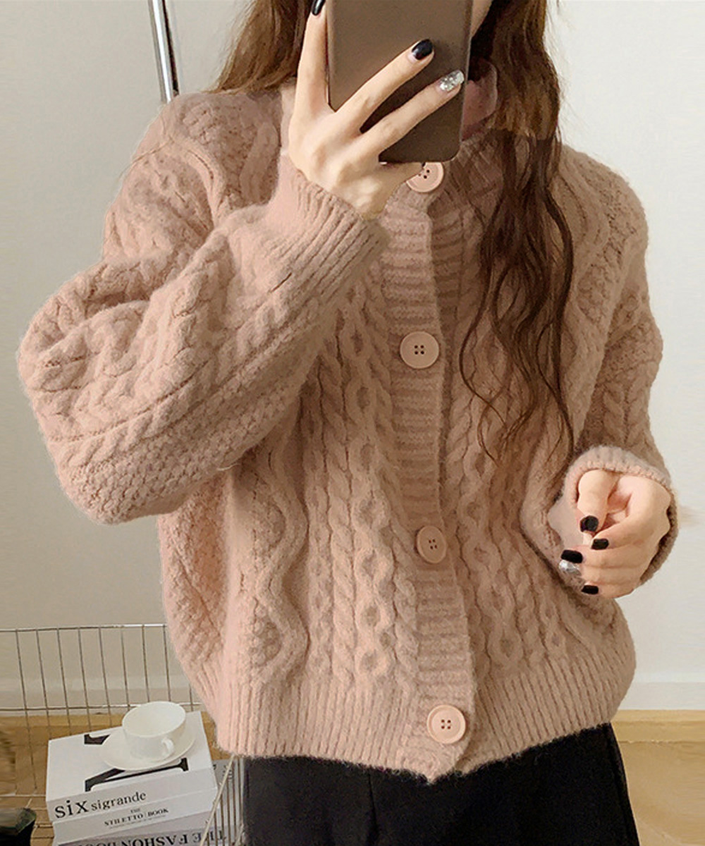 丸みのあるボタンが前面に並んだカーディガンスタイルで、上品で女性らしい仕上がり