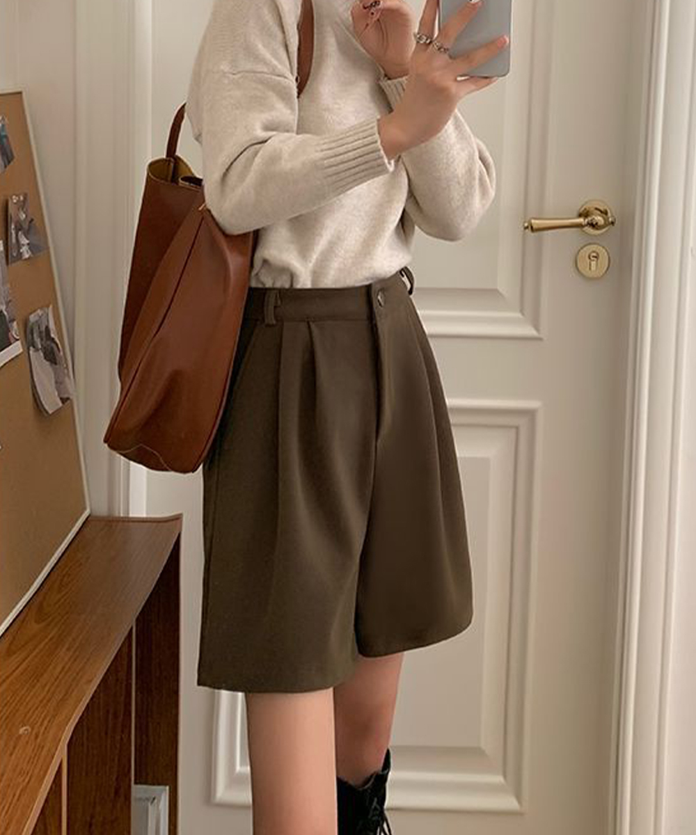 上品な二タック入りのワイド風ショートパンツは、ママコーデにぴったりの万能アイテムです。