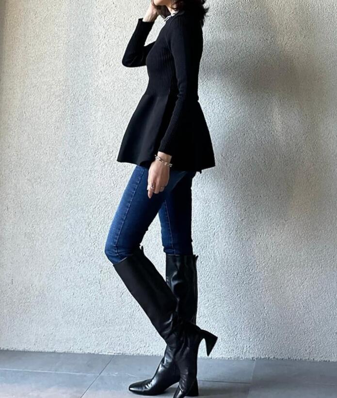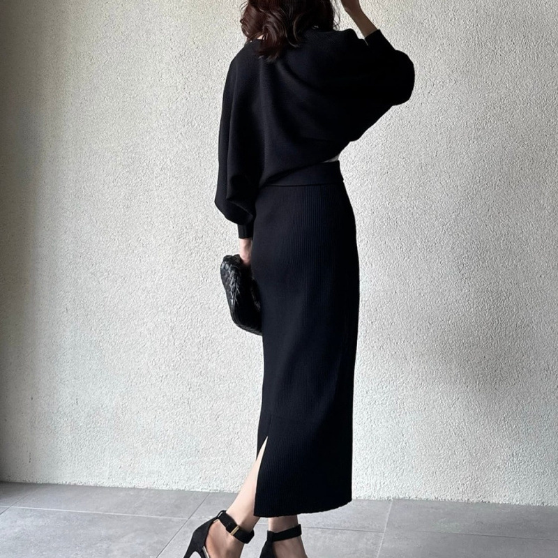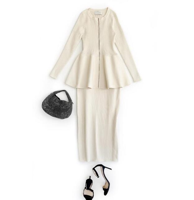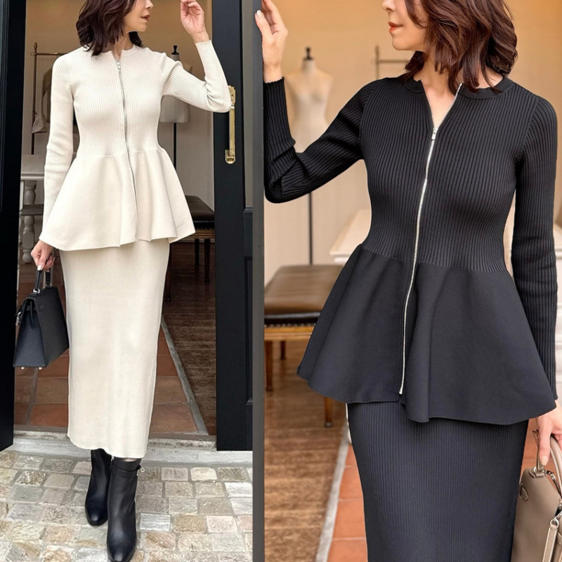 リブニット素材のペプラムトップスとタイトスカートの上品なセットアップで、