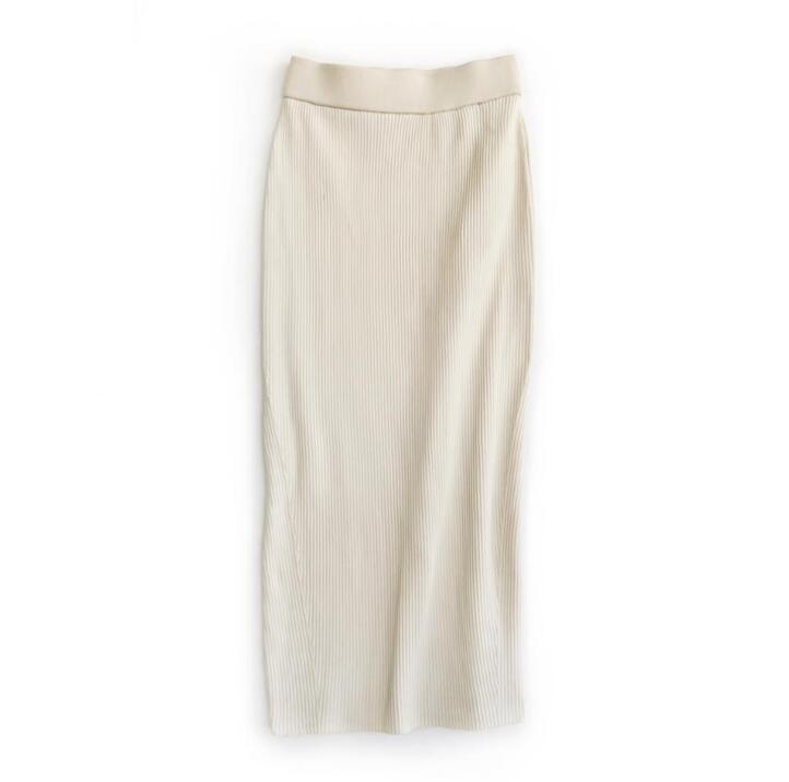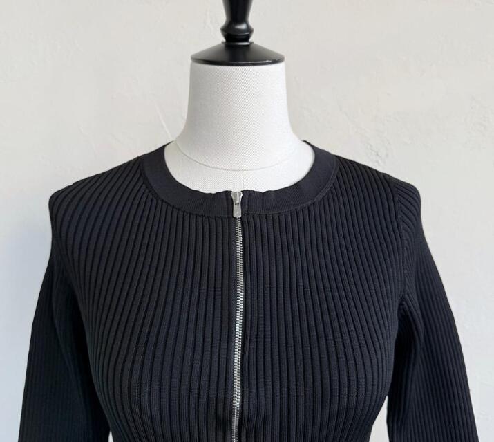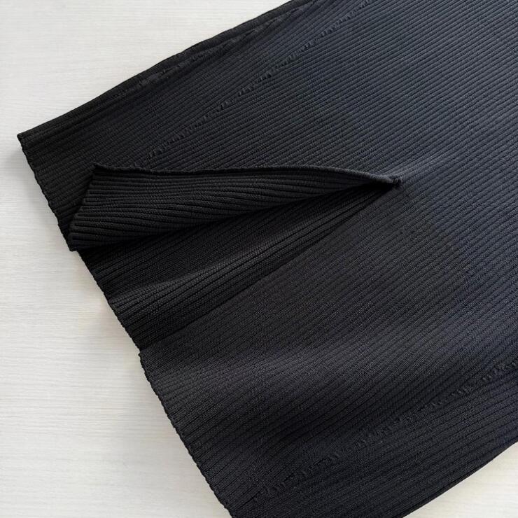 縦のラインを強調するリブ編みが体のラインを美しく見せ、洗練された印象を与えます。